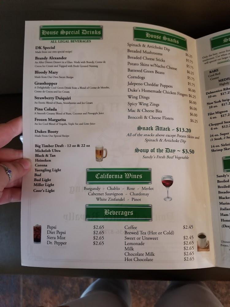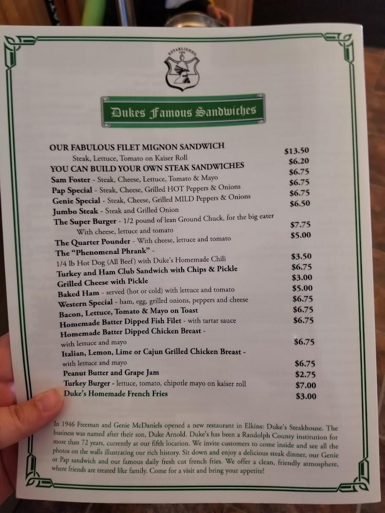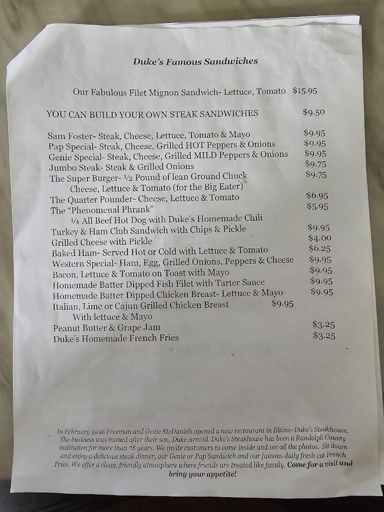 Welcome to Duke's Steakhouse, where flavor meets comfort in the heart of Elkins, WV. Our grill house specializes in mouth-watering American cuisine, featuring local specialties and delightful desserts. Enjoy a relaxed atmosphere perfect for solo diners or groups, with quick service and accessible seating options. Whether you prefer dining in, takeout, or delivery, we cater to your needs. With a diverse menu that includes delicious steaks, healthy choices, and a selection of wines and cocktails, Duke's is the perfect spot for lunch or dinner. Come savor our dishes and experience unforgettable meals at prices that won't break the bank!