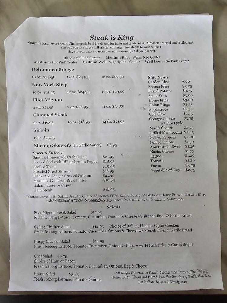 The main course features a range of steaks including the sirloin, strip, and the famous filet mignon. Seafood lovers can enjoy broiled trout or breaded shrimp, prepared to perfection.